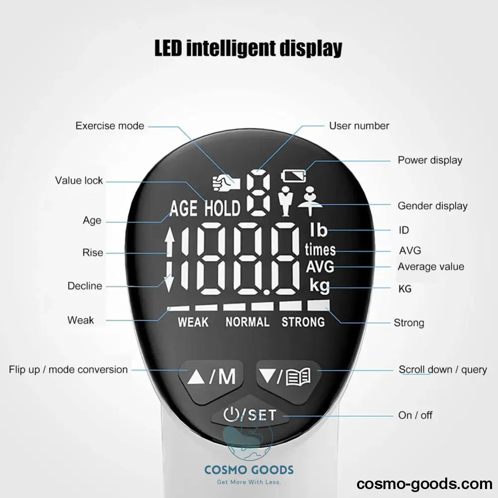 Gebruiksvriendelijke Interface: De PowerTrack Pro heeft een gebruiksvriendelijke interface. Om je metingen te bekijken, hoef je alleen stevig vast te pakken en maximale druk toe te passen.